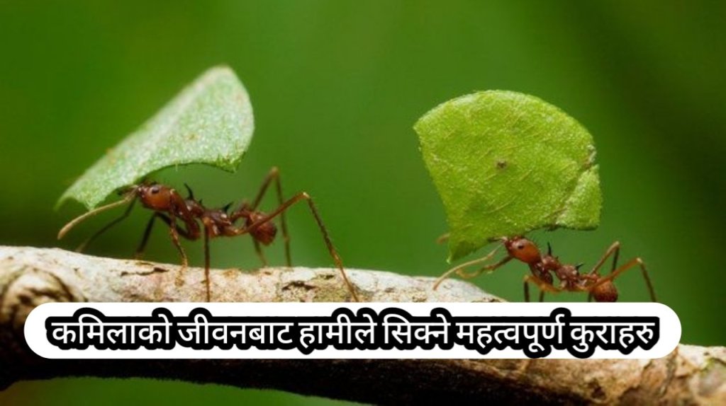 कमिलाहरु लक्ष्य प्रति निरन्तर लागिराख्छन: जहिले पनि कमिला हिड्ने बाटोमा बाधाहरु आउछ तर बाधाको बावजुत पनि बाटो खोजेर निरन्तर हिदिरहन्छन हामो पनि कमिलाबाट के सिकौ भने हामी जीवनको यात्राहरुमा जस्तोसुकै अवरोध र बाधामा पनि हाम्रो काम र लक्ष्यप्रति लागिराखौ, हुनत जीवनमा धेरै बाधाहरु छन् तर त्यो बाट कमिला जस्तै अर्को बाटो अपनाएर भए पनि हामी हिडौ एकदिन पक्कै सफलताको शिखरमा पुग्ने छौ र तपाई पक्कै पुग्नुहुनेछ |